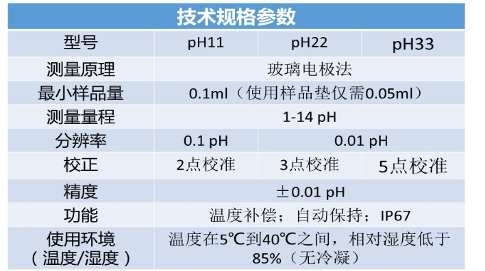 特点 *平面型PH电极 *温度补偿功能 *测量结果快速准确 *可直接测量100微声微量样品 应用 *水质监测/水产养殖 *土壤/食品检测 *实验室实验/质量管理等