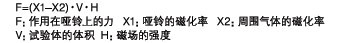 测定原理: 因为氧气带有强烈的恒磁性,在不均匀的磁场中若存在氧气,氧气则会被磁场中的较强的一方所吸引。 在检测部位,装有镜片的玻璃制哑铃依靠白金线呈水平状悬挂。在氧气通过压力的变化根据以下公式计算。